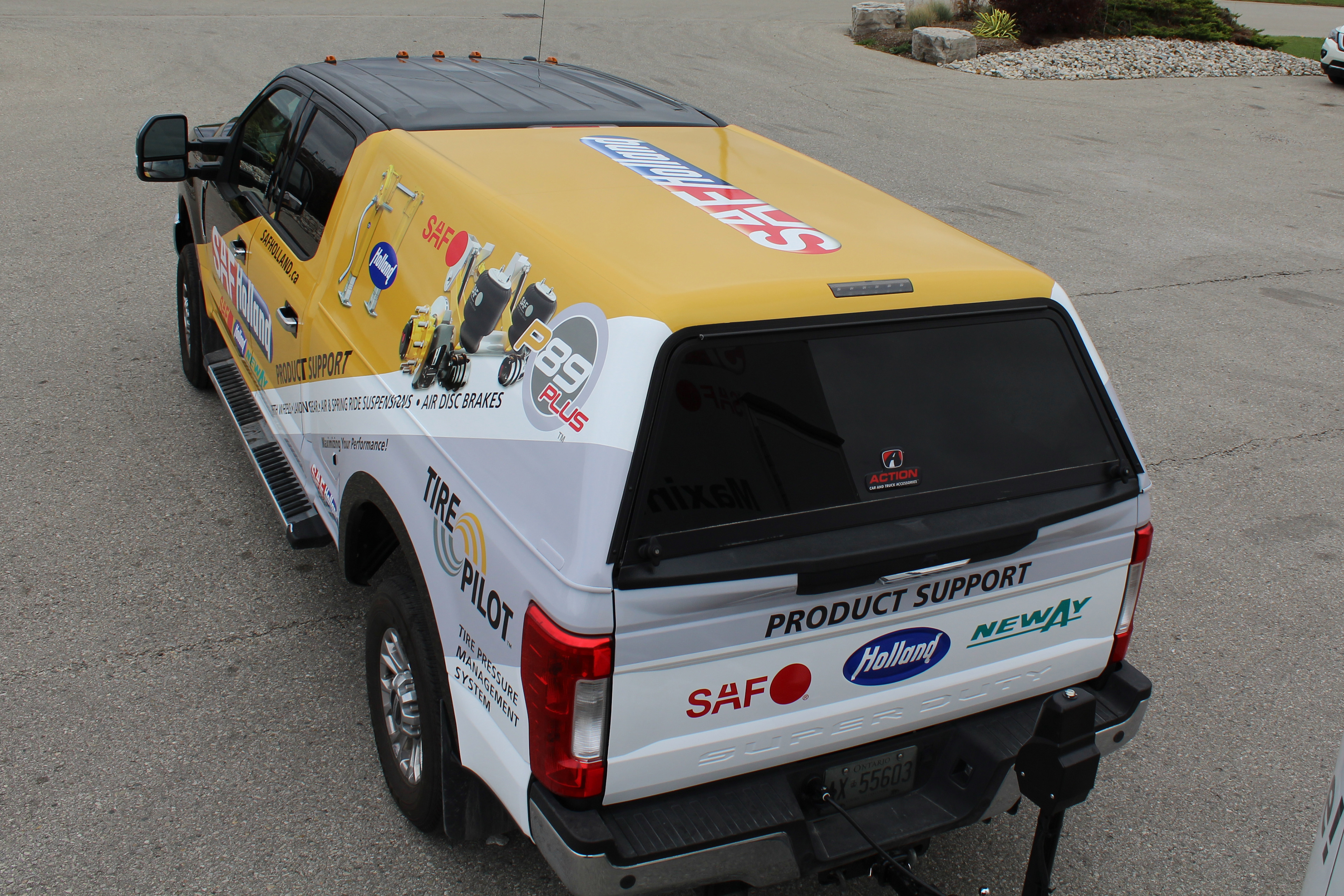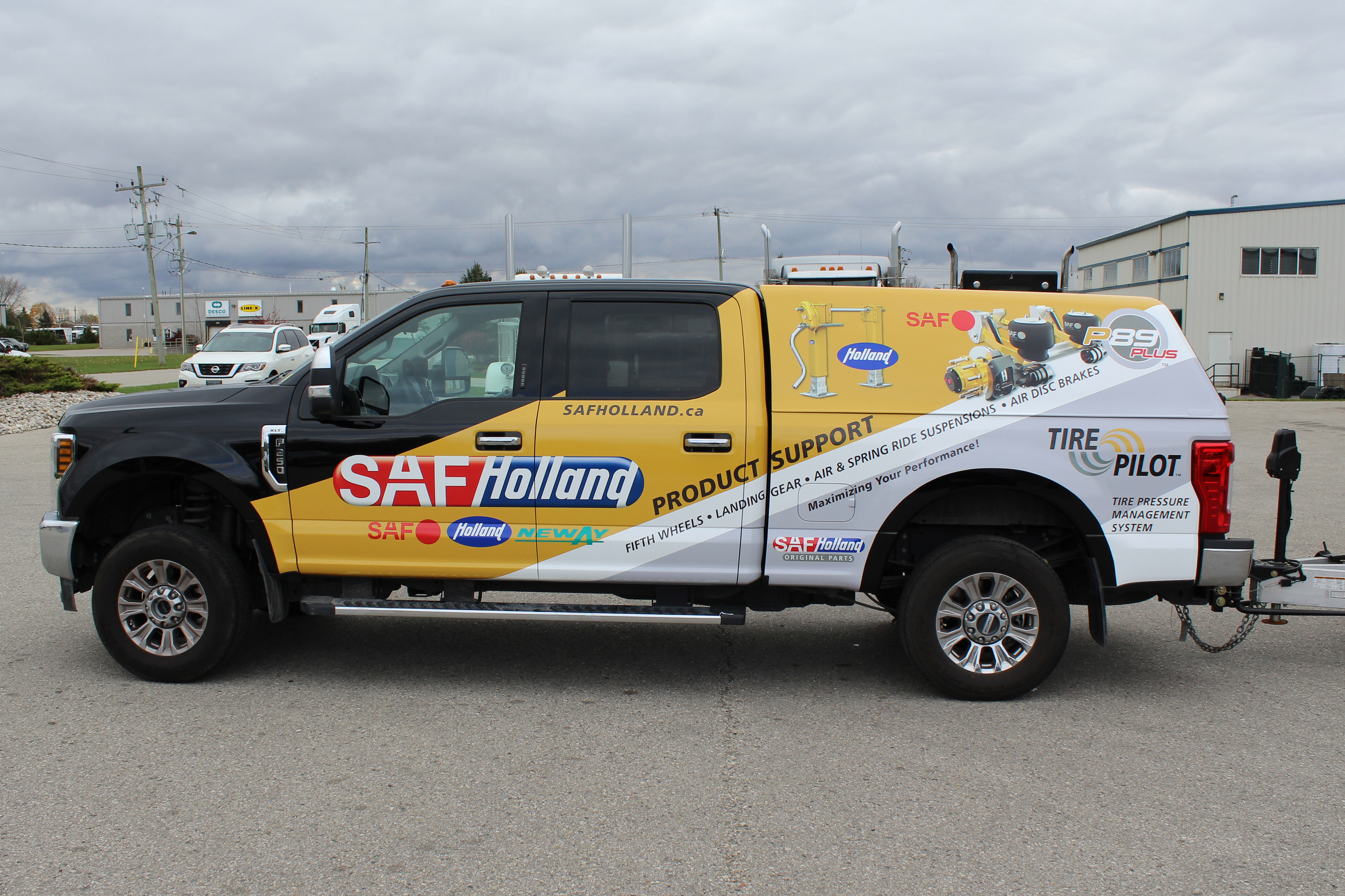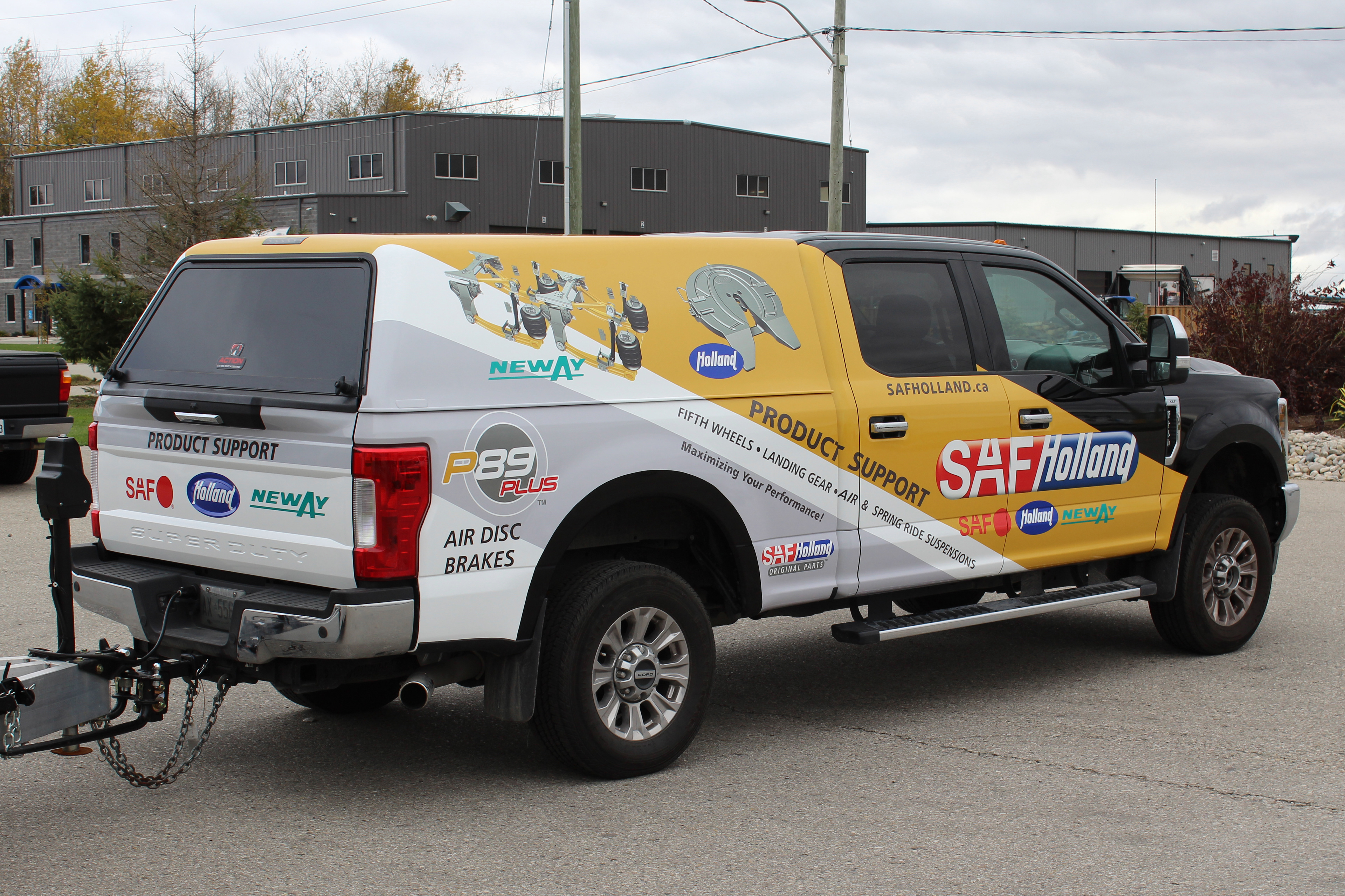 SAF Holland requested this truck wrap coordinated with an existing trailer wrap they done done. We did a unique angled design that stretched over the roof of the truck topper.